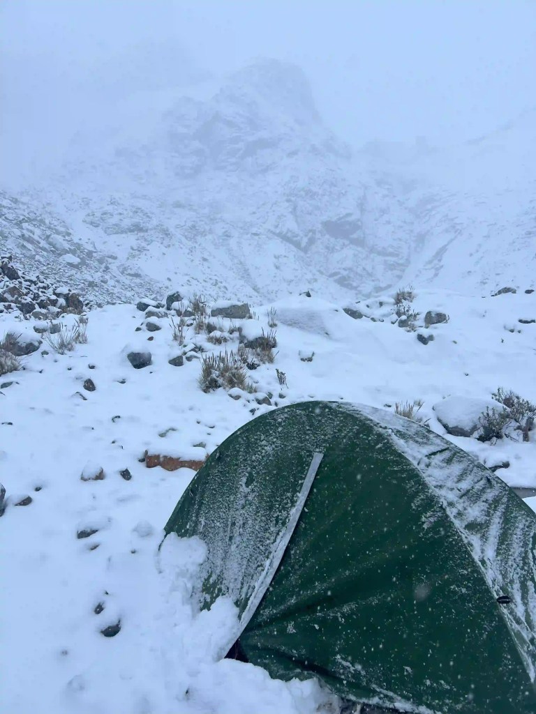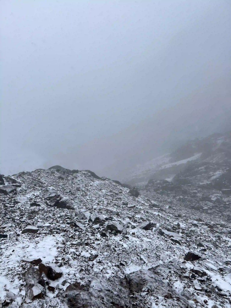 At the summit, thick fog rolled in. I could see only about 50 meters ahead. The descent looked steep, unstable, and blind. I had less than an hour of daylight left. As much as I wanted to be off that mountain, retrieving my pack and rushing down in the dark would be foolish. The snowfall got heavier. I cleared a patch and set up camp on the slope. I would attempt the pass tomorrow.